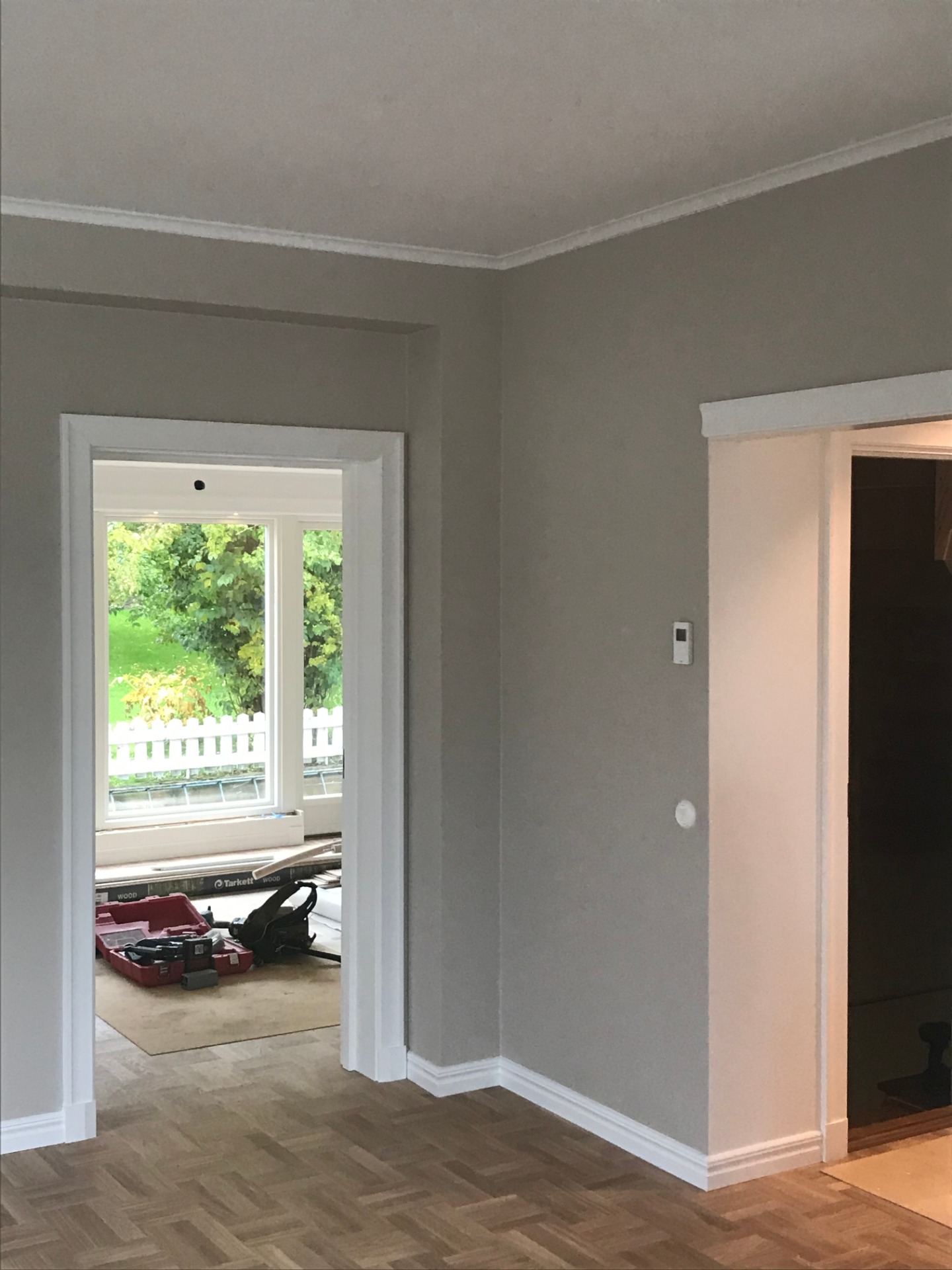 Sprutmålning av tak ventilation och installationer, väggar målade med Kabric KC14. Ett färgat spackel som skapar taktila och vackra väggar som kan underhållas och vårdas precis som en vanlig målad vägg